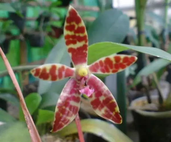 版纳蝴蝶兰(拉丁学名:Phalaenopsis mannii Rchb. f.)又名曼氏蝴蝶兰、曼尼氏蝴蝶兰:兰科,蝴蝶兰属附生草本植物,茎粗厚,具数个节,叶两面绿色,长圆状倒披针形或近长圆形,先端锐尖,花期具叶;花序侧生于茎,不分枝或有时分枝,花序柄粗壮,花苞片披针形,花开展,质地厚,萼片和花瓣橘红色带紫褐色横纹斑块;中萼片倒卵状披针形,先端锐尖,侧萼片斜卵状椭圆形,花瓣近长圆形,唇瓣白色,侧裂片直立,近长方形,药帽黄色,半球形,花粉近椭圆形,3-4月开花。