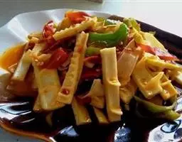 醋熘三丝是以土豆、青椒等为主要食材制作的美食。