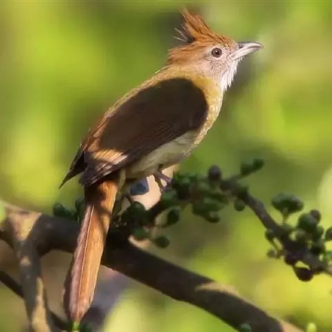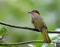 白喉冠鹎:体长20-25厘米。头顶红褐色,有长而细的羽冠、红褐色,头侧灰色。上体橄榄绿黄色,…