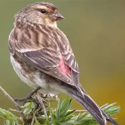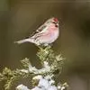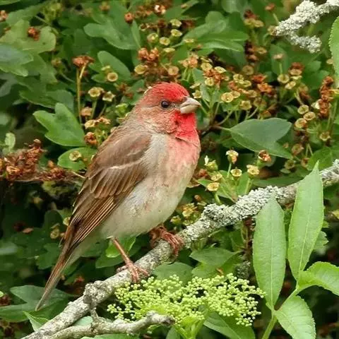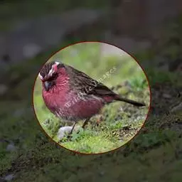 红腰朱雀:体长12-14厘米,小型鸟类。雄鸟前额和眉纹玫瑰粉红色,头顶和一宽的贯眼带深红褐色,背红…