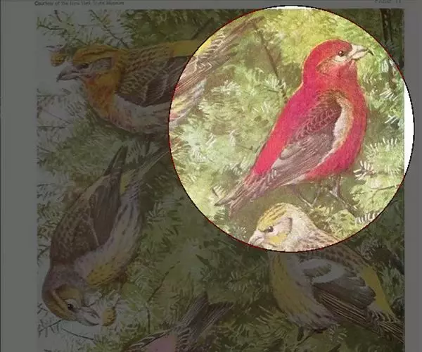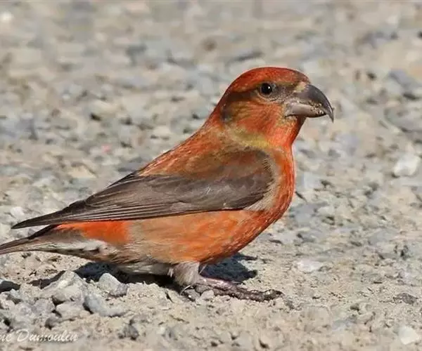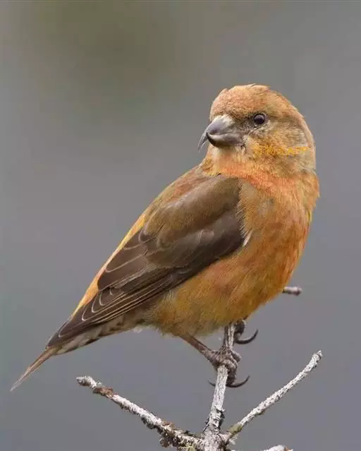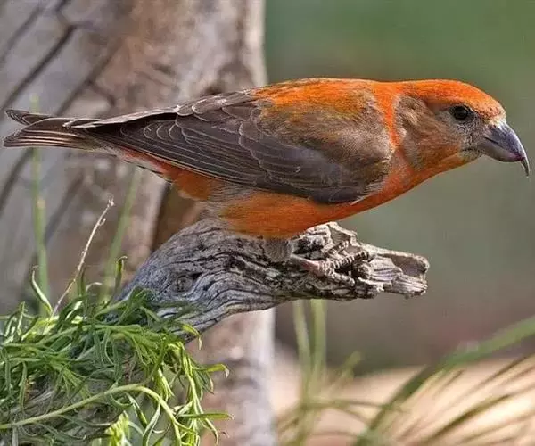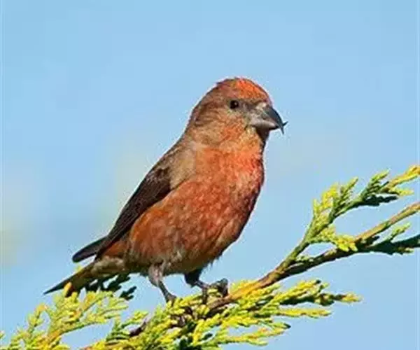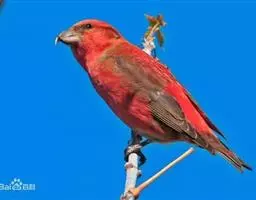 红交嘴雀(学名:Loxia curvirostra):体重28-48克,体长145-175毫米。是燕雀科交嘴雀属的鸣禽。是一种小型的燕雀。雄鸟通体砖红色,上体较暗,腰鲜红色;翼和尾近黑色,头侧暗褐色;雌鸟暗橄榄绿或染灰色,腰较淡或鲜绿色;头侧灰色。两性均具粗大而尖端相交叉的嘴。与除白翅交嘴雀外的所有其它雀类的区别为上下嘴相侧交。繁殖期雄鸟的砖红色随亚种而有异,从橘黄至玫红及猩红,但一般比任何朱雀的红色多些黄色调。红色一般多杂斑,嘴较松雀的钩嘴更弯曲。雌鸟似雄鸟但为暗橄榄绿而非红色。虹膜深褐色,嘴近黑色,脚近黑色。