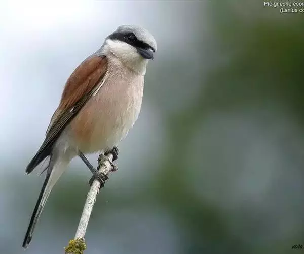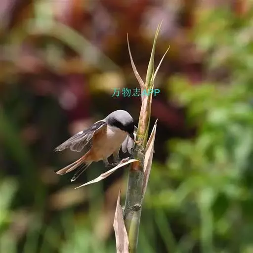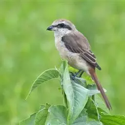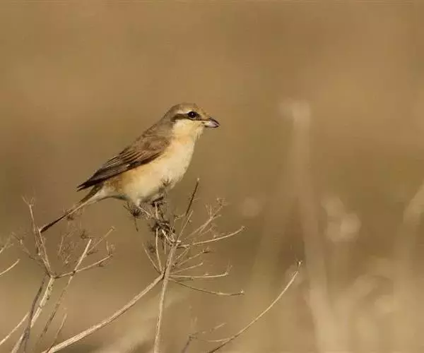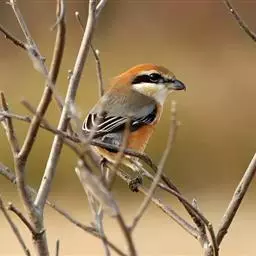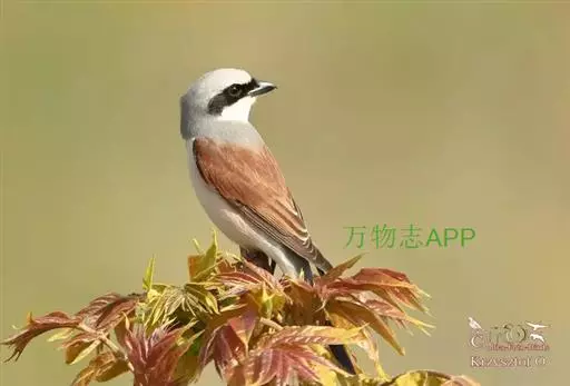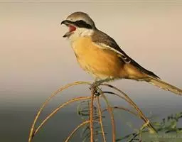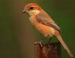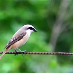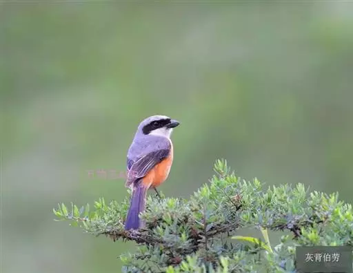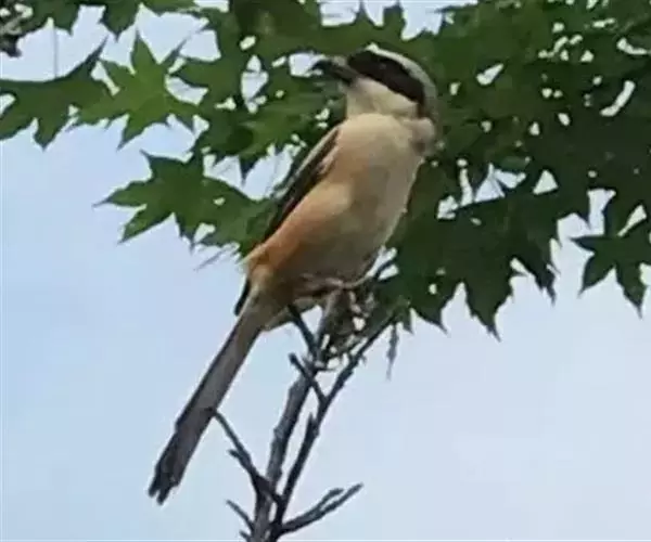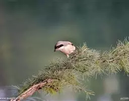红尾伯劳 主要特点是额和头顶前部淡灰色,背面大部呈灰褐色,腹面棕白而无杂斑。头侧具穿过眼部的黑色宽带纹,尾羽呈棕红色。平时栖息于平原或山地的小树或灌木的顶枝上,性格凶猛,举目张望四周,一见有昆虫或其他食饵,即急飞直下而抓住它,然后再返回所栖的树枝上。性贪食。鸣声粗厉响亮,叫时仰首翘尾,激昂有力。营巢活动自 5月下旬至 7月中旬 ,两性参与筑巢 ,营巢期间有求偶交配行为 ,营巢期 6~ 8d。理巢基本全由雄鸟承担,护巢性强。 巢呈粗大的杯状,由草茎、草根、草穗及梗等编成。巢大多建在阔叶树上,每窝产4~6枚乳白色卵,上面密布有深浅不一的蓝灰和黄褐色斑点。