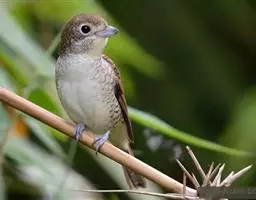 白肩鹊鵙是小型鸣禽。喙粗壮而侧扁,先端具利钩和齿突,嘴须发达;翅短圆;尾长,楔形;跗跖强健,趾具钩爪。…