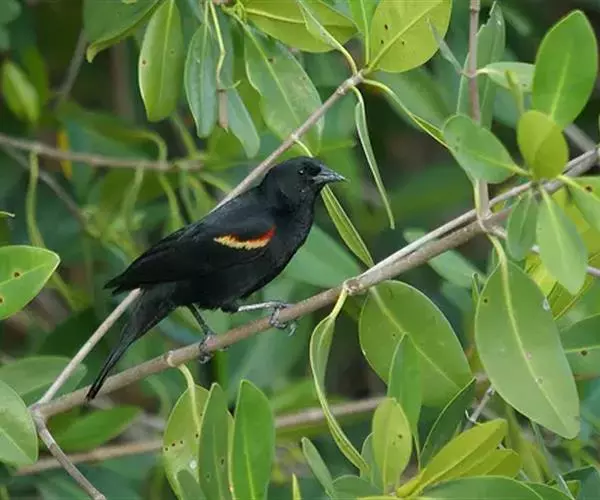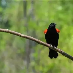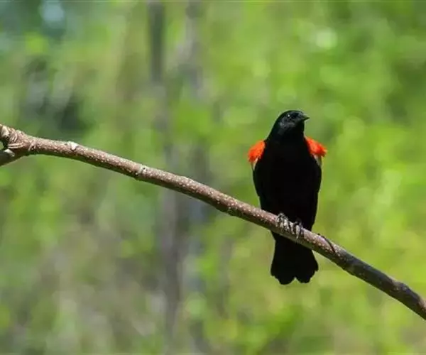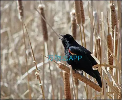 红翅黑鹂,是美洲黑鸟中最出名的是红翅黑鸟,体长19-24厘米,翼展30-37厘米,体重65克,春天雄鸟羽色翅膀上端橘红色连带小块白色,似大帅的红色肩章,头部及爪呈深蓝光泽,所有的羽毛都呈蓝黑色,因雄鸟肩翅呈现鲜艳的红色而得名。秋天羽毛边缘会变成锈色,大都生活在北美沼泽地带。