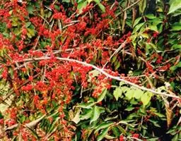 蕊帽忍冬 常绿或半常绿灌木,高达1.5米;幼枝密生短糙毛,老枝浅灰色而无毛。叶革质,形状和大小变异很大,通常卵形至矩圆状披针形或菱状矩圆形,长1-5(-6.5)厘米,顶端钝,基部通常楔形,上面深绿色有光泽,中脉明显隆起,疏生短腺毛及少数微糙毛或近无毛。