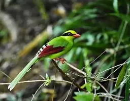蓝绿鹊:中型鸟类,共有5个亚种。体长36-38厘米。尾长,嘴、脚红色。通体羽色主要为草绿色,…