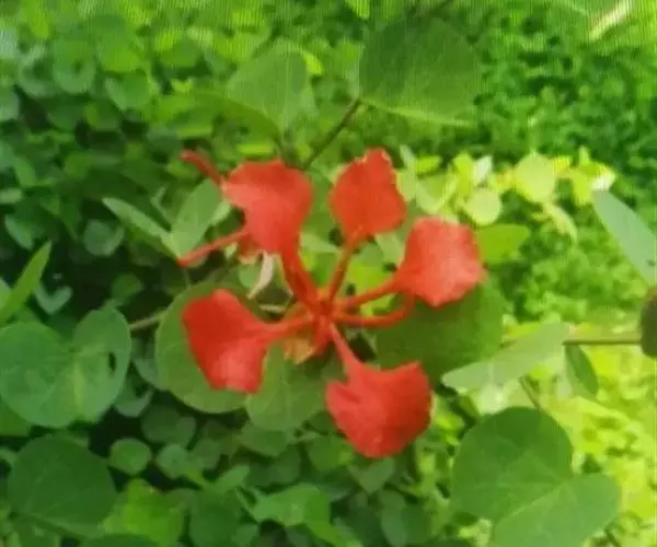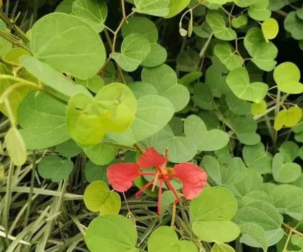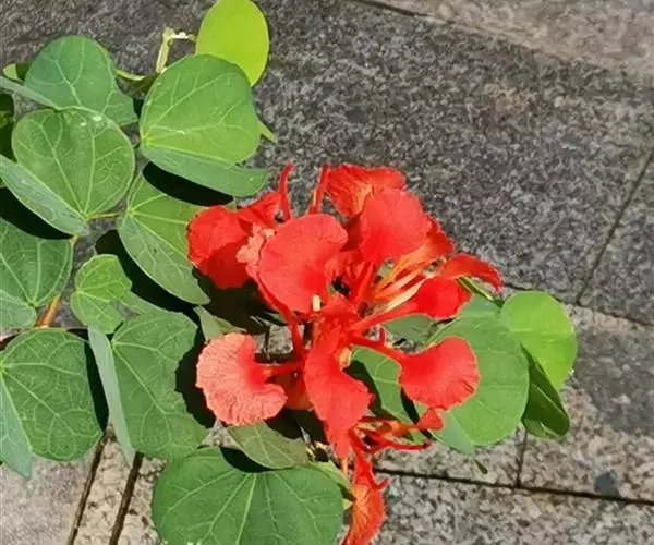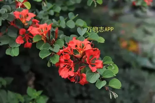 橙花羊蹄甲,学名:Bauhinia galpinii N.E. Brown.,别称:嘉氏羊蹄甲、南非羊蹄甲、橙红花羊蹄甲,属豆科羊蹄甲属,为常绿攀援状灌木,植株高度为50~150cm,枝条细软、平整,向四周匍匐伸展,冠幅常大于高度,其树形美观,枝繁叶茂,四季常绿,花色为极其罕见的砖红,在广州每年5~11月开花,花期长、花量大。有抗炎热,耐干旱,抗风性强等特性,非常适合屋顶绿化、道路绿化及观花地被,是一种观赏价值较高的园林植物,同时,橙花羊蹄甲具有重要的生态和药用价值。
