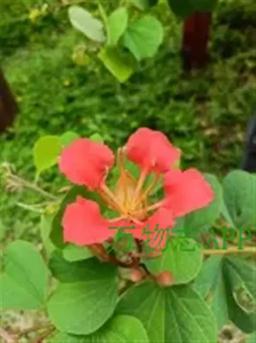 常绿攀援灌木,植株整体比较矮小;小枝顶端被微柔毛; 无卷须;叶坚纸质,宽明显大于长;先端 2 裂达叶长的的 1/5 ~ 1/2,裂片顶端钝圆;叶柄被微茸毛;聚伞花序伞房状,侧生,被锈色柔毛;花萼开花时向外反折;花瓣红色,倒匙形,有瓣柄;能育雄蕊 3 枚,退化雄蕊 7 枚;荚果长圆形,果瓣较厚,无毛;种子扁平,有光泽,直径约 8 mm;花期 4 ~ 11月;果期 7 ~ 12 月。