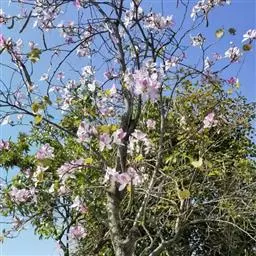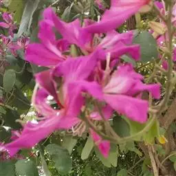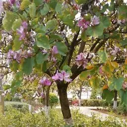 洋紫荆:落叶乔木;树皮暗褐色,近光滑;幼嫩部分常被灰色短柔毛;枝广展,硬而稍呈之字曲折,无毛。叶近…