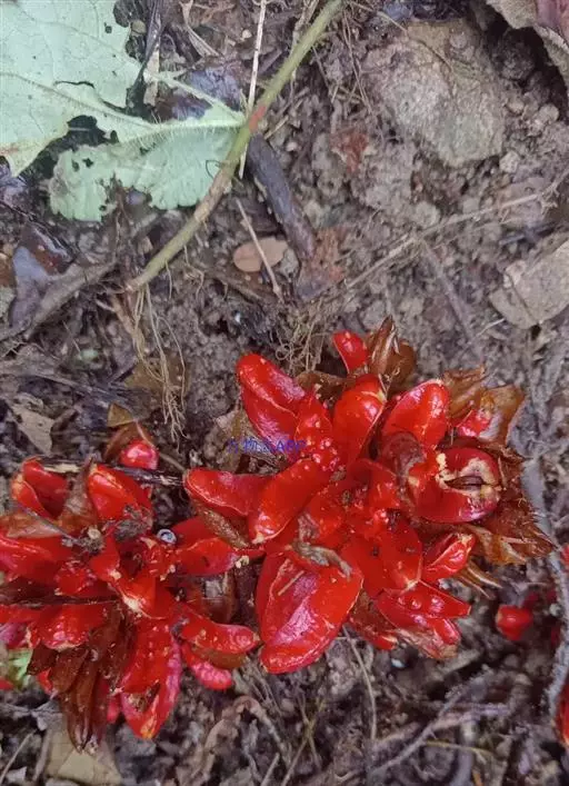 株高0.5-1米;根茎淡黄色。叶片披针状椭圆形或线状披针形,长20-37厘米,宽4-6厘米,叶面无毛,叶背无毛或被稀疏的长柔毛,顶端尾尖;叶柄长0.5-1.7厘米或无柄;叶舌膜质,2裂,长0.3-1.2厘米。穗状花序椭圆形,长5-7厘米;总花梗从没有到长达17厘米,被长圆形鳞片状鞘;苞片覆瓦状排列,椭圆形,红绿色,具紫脉;花萼长2.5-3厘米,一侧开裂;花冠管较萼为长,裂片披针形,长2.7-3厘米,宽约7毫米,淡黄色;唇瓣卵形,3裂,中裂片长2.5厘米,宽1.8厘米,中部黄色,边缘白色,侧裂片长1.3厘米,宽4毫米;花药、药隔附属体各长1厘米。果倒卵形,熟时裂成3瓣,果皮里面鲜红色;种子黑色,被白色假种皮。花期:8-10月。