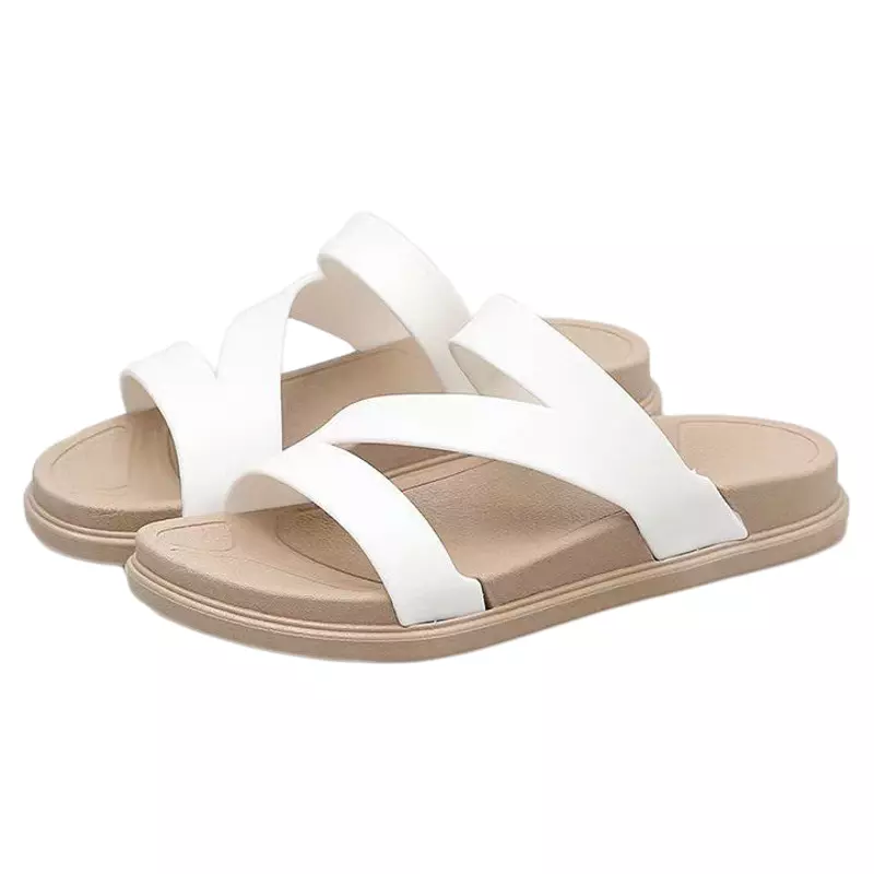 EVA底的优点是:牢固,轻便,易清洗,舒适透气,柔软,色彩丰富。易加工,易黏合,不易脱落。适合做为沙滩鞋,家用休闲拖,旅行拖鞋等。