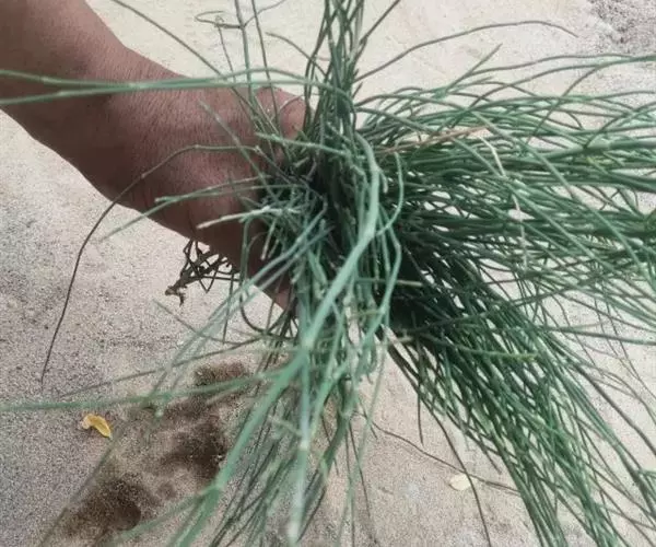基部扁平或弧形,早落或宿存,齿上气孔带明显或不明显。侧枝较硬,圆柱状,孢子囊穗短棒状或椭圆形,长0.5-2.5厘米,中部直径0.4-0.7厘米,顶端有小尖突,无柄性状呈长管状,不分枝,长40~60cm,直径0.2~0.7cm。表面灰绿色或黄绿色,有18~30条纵棱,棱上有多数细小光亮的疣状突起;节明显,节间长2.5~9cm,节上着生筒状鳞叶,叶鞘基部和鞘齿黑棕色,中部淡棕黄色。体轻,质脆,易折断,断面中空,周边有多数圆形的小空腔。气微,味甘淡、微涩,嚼之有沙粒感。