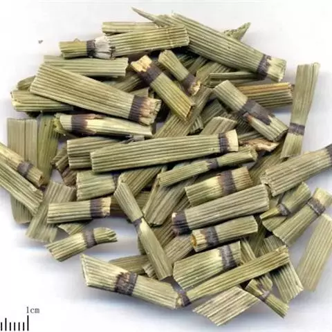 粉末灰绿色。镜下可见:茎表皮碎片较多,近无色或淡黄色。表面观表皮细胞呈长方形或长条形,垂周壁甚厚,深波状弯曲,胞腔内含黄棕色色素颗粒,表面常有裂隙;纵断面观呈扁长方形,壁厚,孔沟明显,棱脊处细胞外壁向外突出,具硅质瘤状突起。气孔深陷,纵向排列,类圆形或长椭圆形,直径75~85微米,长75~108微米,保卫细胞内壁有多数横向平行的增厚条纹。叶鞘表皮碎片黄棕色或棕色,细胞呈长方形或长菱形,脊处细胞垂周壁稍厚,深波状弯曲,槽处细胞垂周壁平直;气孔类圆形,较小。纤维大多成束,常与表皮相连,端壁斜尖或平截,孔沟明显,纹孔小而稀疏,人字形或斜缝状。梯纹管胞细长,纹孔大,椭圆形。内皮层细胞类长方形,壁稍厚,略呈波状弯曲,有光泽。
