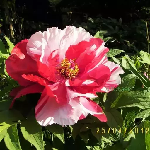 皇冠型:外花瓣2-5轮,宽大平展,雄蕊大部分或全部瓣化成细碎曲皱花瓣,瓣群周密高耸,形似皇冠。内花瓣排列不规则,瓣间常杂有正常雄蕊或退化中的雄蕊,瓣间也常残留有花药;雌蕊退化或瓣化,偶有结实。此类花型以“蓝田玉”、“胡红”、“姚黄”、“首案红”、等品种为代表。
