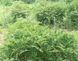 坡根型:此类根条粗细长短不一,分生侧根较多,交叉生长,俗称“鸡爪根”,多数入土较浅,斜坡角度大。如“青山贯雪”、“白玉”、“黄花葵”等品种,此类牡丹产丹皮质量、产量低于直根型,不适于药用栽培。