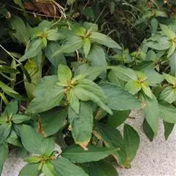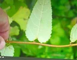 叶互生,纸质,叶片卵形或卵状披针形,稀椭圆形,长6-13厘米,宽2-5.5厘米,顶端渐尖,基部渐狭或短尖,有时钝,边缘有尖的腺状密锯齿,齿间距1-2毫米;中脉两面均凸起,背面尤著,侧脉6-10对,弧形上升,离缘2-3毫米弯拱网结,网脉明显;叶柄长2-5毫米,无腺体;托叶小,腺体状,长约0.5毫米。