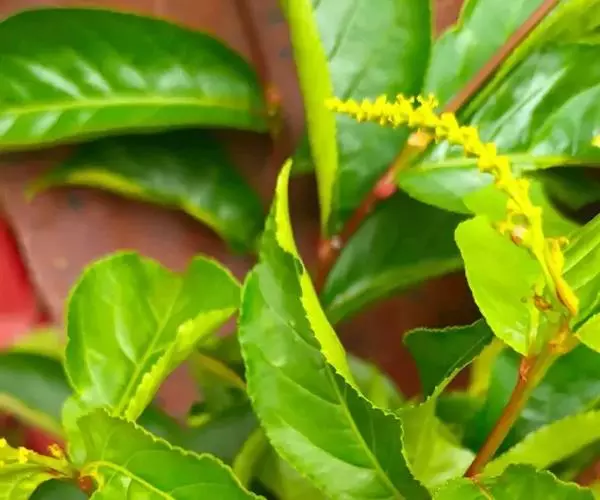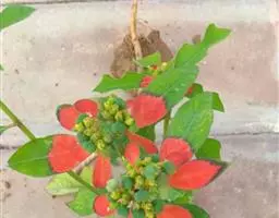 花单性,雌雄同株同序,花序顶生和腋生,长2.5-6厘米,雌花生于花序轴下部,雄花生于花序轴上部。雄花:花梗极短;苞片阔卵形或三角形,长约1. 3毫米,宽约1.5毫米,顶端凸尖,基部两侧各具一近圆形、直径约1毫米的腺体,每一苞片内有花2-3朵;萼片3,披针形,长约1.2毫米,宽0. 6-0.8毫米;雄蕊3枚,花药球形,比花丝长。雌花花梗极短或不明显;苞片卵形,长约2.5毫米,宽近1.5毫米,顶端芒尖,尖头长达1.5毫米,基部两侧各具一正圆形、直径约1.5毫米的腺体;小苞片2,长圆形,长约1.5毫米,顶端具不规则的3齿;萼片3,基部稍联合,卵形,长约1.5毫米,宽约1.2毫米,顶端尖,边缘有不明显的小齿;子房球形,直径约1.5毫米。