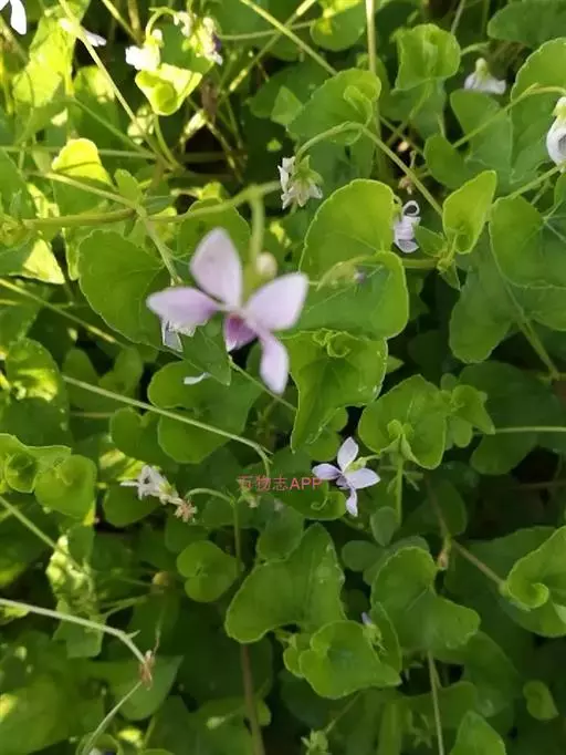 如意草又名弧茎堇菜。多年生草本,高达35cm。根茎横走,粗约2mm,褐色,密生多数纤维状根,向上发出多条地上茎或匍匐枝,地上茎通常数条丛生,淡绿色,节间较长;匍匐枝蔓生,节上生不定根。基生叶三角状心形或卵状心形,先端急尖,稀渐尖,基部通常心形,边缘有疏锯齿,长1.5-3cm,宽2-5.5cm,具长柄;茎生叶与基生叶片相似,叶柄较短;托叶披针形,长5-10cm,全缘或具极稀疏的细齿和缘毛。花淡紫色或白色,单生于叶腋,具长梗,花梗中部以上有2枚线形小苞片;花萼卵状披针形,基部附属物极短呈半圆形;花瓣狭倒卵形,下方花瓣较短,有明显的暗紫色条纹,基部具长约2mm的短距。子房无毛,花柱呈棍棒状,柱头2裂,两侧裂片肥厚,向上直立,中央部分隆起呈鸡冠状。蒴果长圆形,长6-8mm,粗约3mm,无毛,先端尖。花、果期较长。