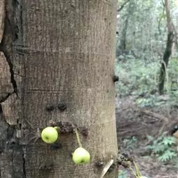核果梨形,具宿存苞片,成熟的核果,直径2厘米,鲜红至紫红色;种子无胚乳,外种皮坚硬,子叶肉质,胚根小。果期5-6月。