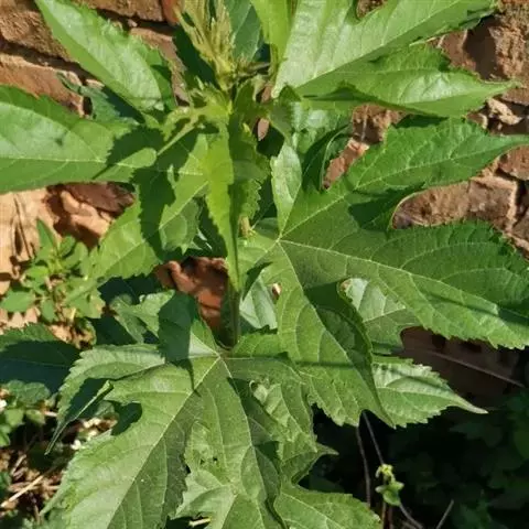 叶椭圆形至倒卵形,幼时被浓密的长粗毛,达缘具锯齿,成长之叶长椭圆形,长7-19厘米,宽3-6厘米,先端渐尖,基部圆形至浅心形,两侧不对称,表面深绿色,疏生长粗毛,背面浅绿色,密被长粗毛,沿中脉更密,干后变为茶褐色,侧脉10-13对;叶柄短,长约5-8毫米,被长粗毛;托叶披针形,早落。