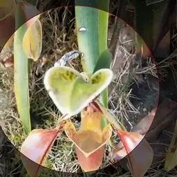 花瓣紫红色,倒卵状楔形,长1.1-1.5毫米,宽约1毫米,先端截形而其中央凹缺,具1条脉;唇瓣匙形,3裂;侧裂片紫红色,直立,半卵形,长1.5毫米,宽约1毫米;中裂片白色,厚肉质,匙形,向前伸展,长2-2.5毫米,宽1.7-2.1毫米,先端钝,基部具短爪;距紫红色,与子房平行,圆锥形,长约2毫米,粗1.5毫米,末端钝;距口前方具1个肉质舌状物伸入距内;蕊柱黄褐色,长约0.8毫米;蕊喙2裂,其裂片很短小,先端钝;药帽黄褐色,前端伸长为先端钝并且向上翘起的三角形。