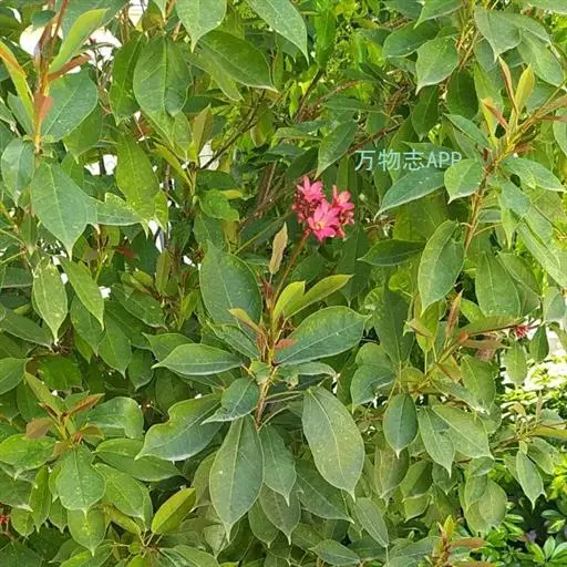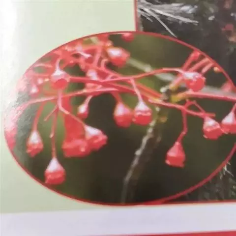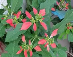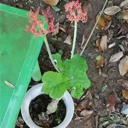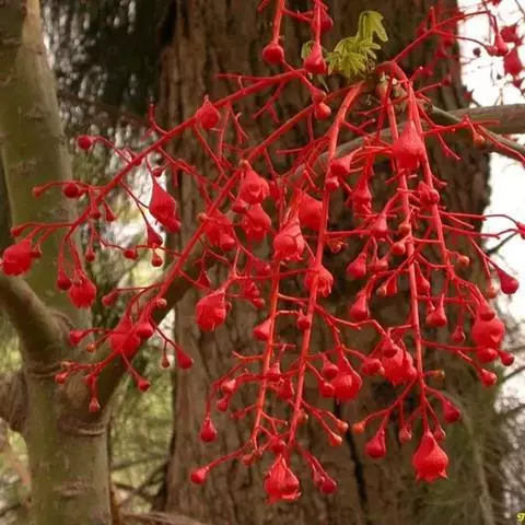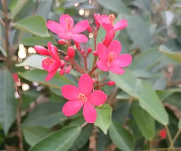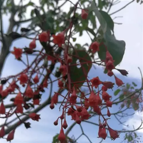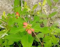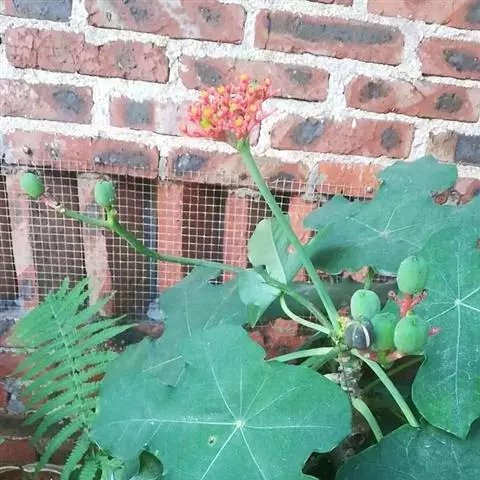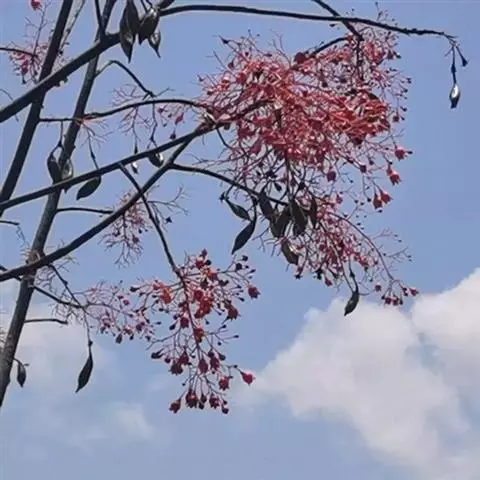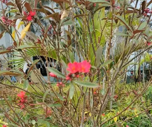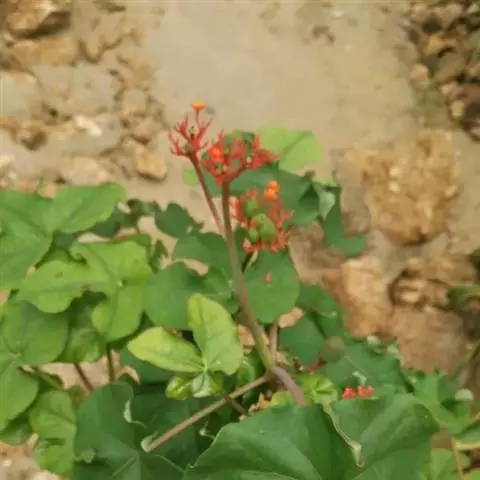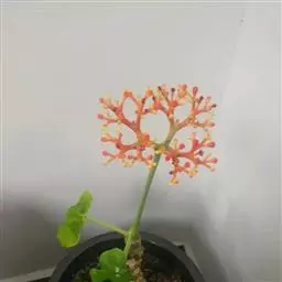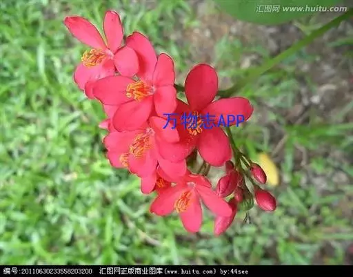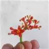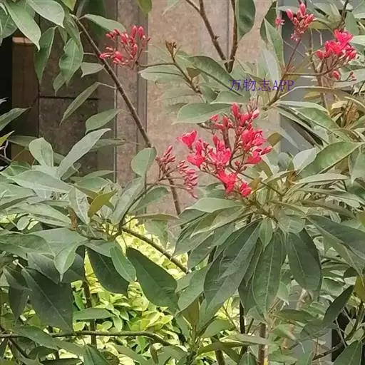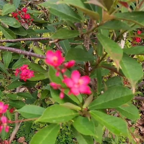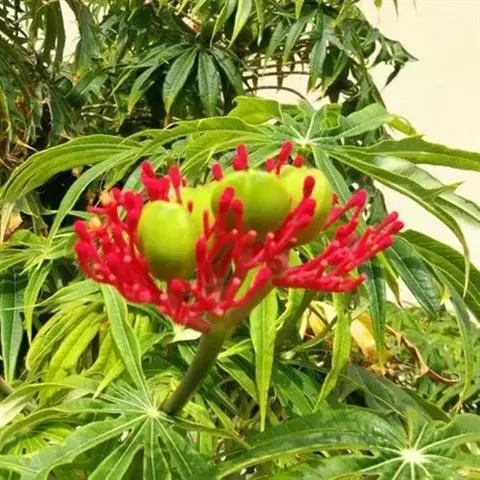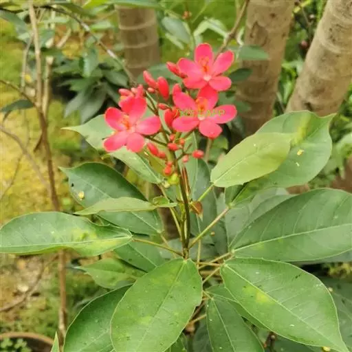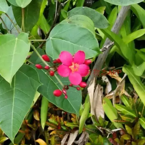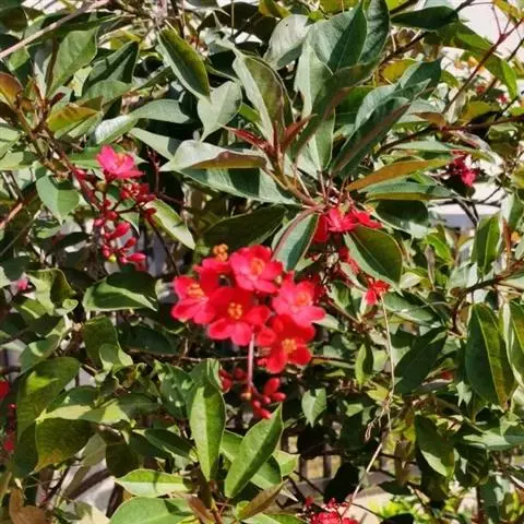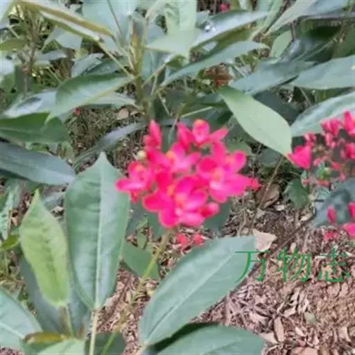 聚伞花序,花瓣5片,花冠红色;且为单性花,雌雄同株,自着生于不同的花序上;另有粉红品种。蒴果成熟时呈黑褐色。