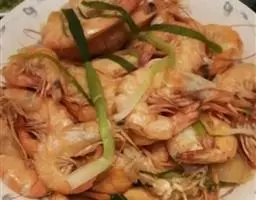 4)然后将虾倒进锅中,淋料酒,耗油,食盐适量,放入葱段,盖锅盖闷1—2分钟即可。