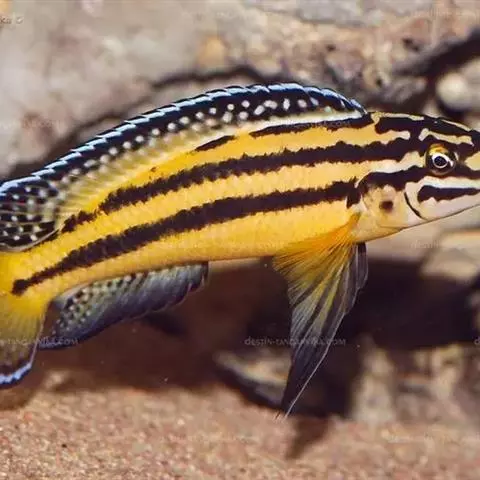 身体侧扁,嘴比较大,可以伸缩。下颌突出,眼睛也非常大,在头的前半部,它们身体颜色搭配非常美丽,身体呈橄榄绿色,有几条粗的石青色条纹横在背部,尾部淡黄色,是一种欣赏价值很高的鱼类。