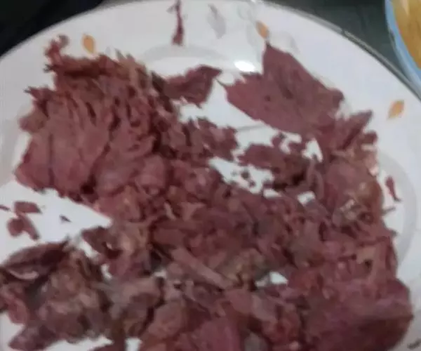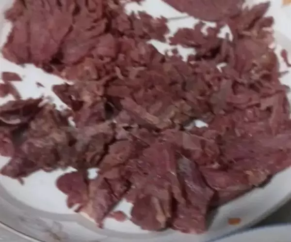 2.羊肉冻硬,把冻肉进一步剥除肉头、边角、脆骨、云皮、筋膜等,然后切成15~20厘米长、3~5厘米的宽的极薄片,码在盘中待用。