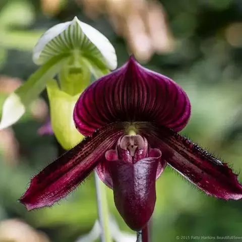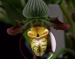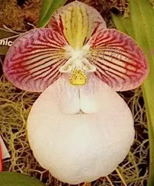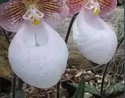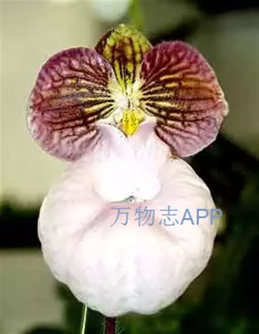 花葶直立,长10-26厘米,紫红色而有深色斑点,被长柔毛,顶端具1花;花苞片卵形或宽卵形,绿色而有紫色斑点,长1-1.4厘米,背面疏被长柔毛;花梗和子房长3.5-4.5厘米,被长柔毛;花大,艳丽,中萼片与花瓣通常白色而有黄色晕和淡紫红色粗脉纹,唇瓣白色至淡粉红色,退化雄蕊黄色并有淡紫红色斑点和短纹;中萼片卵形或宽卵形,长2-3厘米,宽1.8-2.5厘米,先端急尖,背面被长柔毛并有龙骨状突起;合萼片卵形或宽卵形,长2-2.8厘米,宽1.8-2.8厘米,先端钝或急尖,背面被长柔毛并具2条稍钝的龙骨状突起;花瓣宽卵形、宽椭圆形或近圆形,长2.8-3.2厘米,宽2.6-3.5厘米,先端钝或浑圆,内表面基部具白色长柔毛,背面多少被短柔毛;唇瓣深囊状,卵状椭圆形至近球形,长4.5-6.5厘米,宽4.5-5.5厘米,基部具短爪,囊口近圆形,整个边缘内折,囊底有白色长柔毛;退化雄蕊椭圆形,长1-1.5厘米,宽7-8毫米,先端急尖,两侧边缘尤其中部边缘近直立并多少内弯,使中央貌似具纵槽;2枚能育雄蕊由于退化雄蕊边缘的内卷而清晰可辨,甚为美观。花期3-5月。