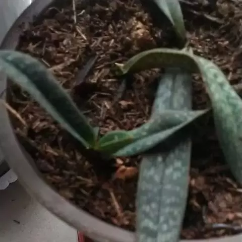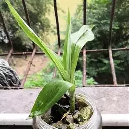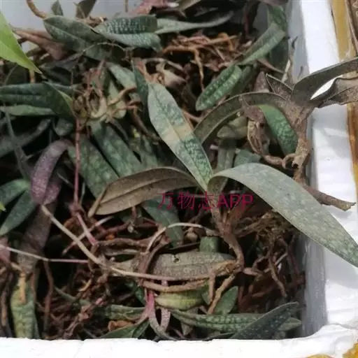 叶基生,二列,4-5枚;叶片长圆形或舌状,坚革质,长5-15厘米,宽1.5-2厘米,先端钝,上面有深浅绿色相间的网格斑,背面有密集的紫斑点并具龙骨状突起,基部收狭成叶柄状并对折而彼此套叠。