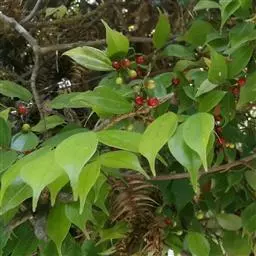 香叶树(Lindera communis Hemsl.)为樟科常绿灌木或小乔木植物,树皮淡褐色。当年生枝条纤细,平滑,具纵条纹,绿色,干时棕褐色,或疏或密被黄白色短柔毛,基部有密集芽鳞痕,一年生枝条粗壮,无毛,皮层不规则纵裂。果卵形,熟时红色。生长于丘陵和山地下部的疏林中。喜酸性土壤,耐修剪。植物的枝叶或茎皮可供药用,出自《广西药用植物名录》,全年可采,树皮应刮去粗皮,晒干。具有解毒消肿,散瘀止痛之功效。民间用于治疗跌打损伤及牛马癣疥等。此外,植物的叶和果可提取芳香油;种仁含油50%,供工业或食用。