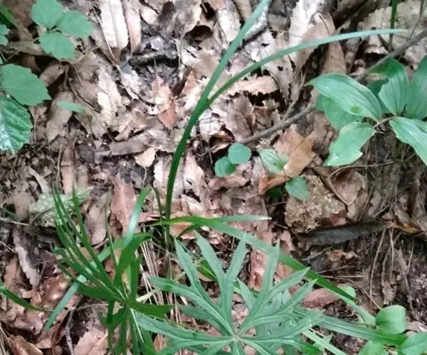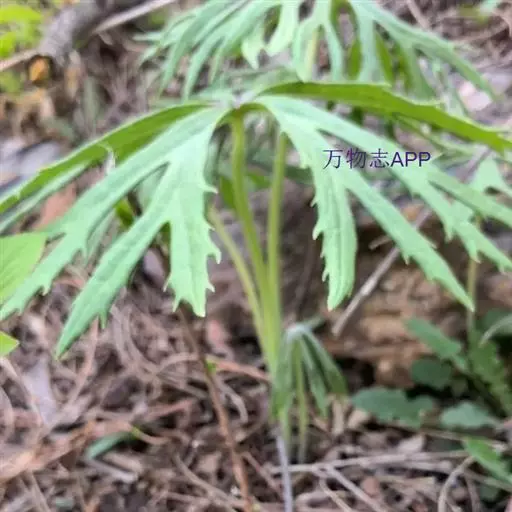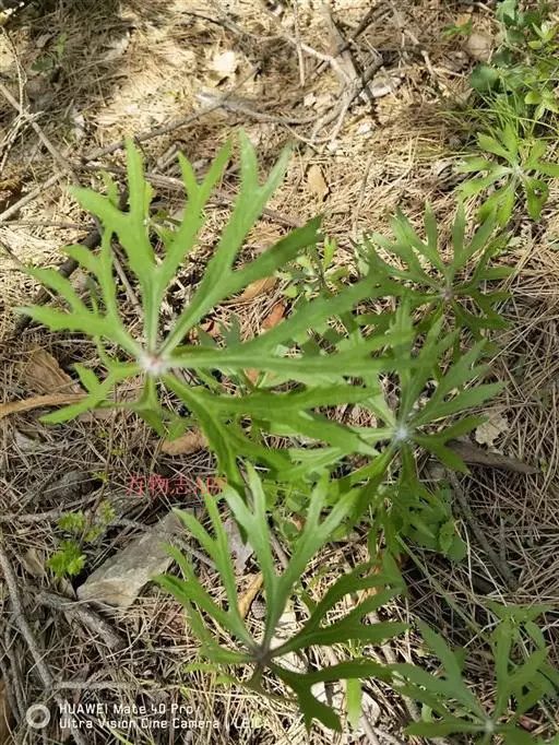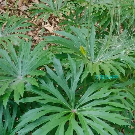 多年生草本。几根状茎短,横走,具多数须根,茎直立,高70-120厘米,下部直径2.5-6毫米,紫褐色,无毛,具纵肋,不分枝。叶通常2,疏生;下部叶具长柄;叶片盾状圆形,直径20-30厘米,掌状深裂;裂片7-9,每裂片再次2-3浅裂;小裂片宽4-8毫米,线状披针形,边缘具不等长的锐齿,顶端渐尖,初时反折呈闭伞状,被密蛛丝状绒毛,后开展成伞状,变无毛,上面淡绿色,下面灰色;叶柄长10-16厘米,无翅,无毛,基部抱茎;中部叶较小,直径12-24厘米;裂片通常4-5;叶柄长2-6 厘米。其余的叶呈苞片状,披针形,向上渐小,无柄或具短柄。