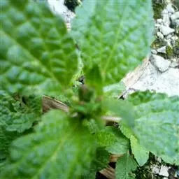 亚灌木状草本,高可达90厘米。茎钝四稜形,具浅槽,无毛。叶卵圆形或三角状卵圆形,长2.5-7厘米,宽2-4.5厘米,先端渐尖,基部截形或圆形,稀钝,边缘具锯齿,上面绿色,下面较淡,两面无毛,下面具腺点;茎生叶叶柄长3-4.5厘米,无毛。