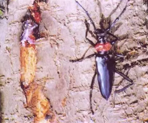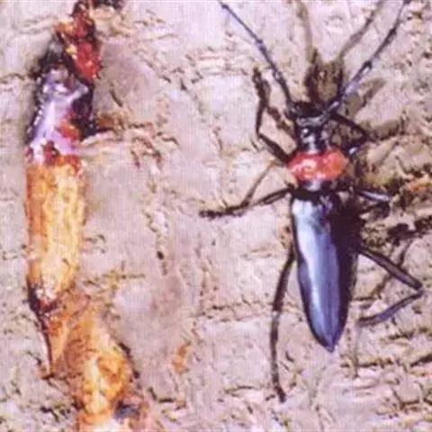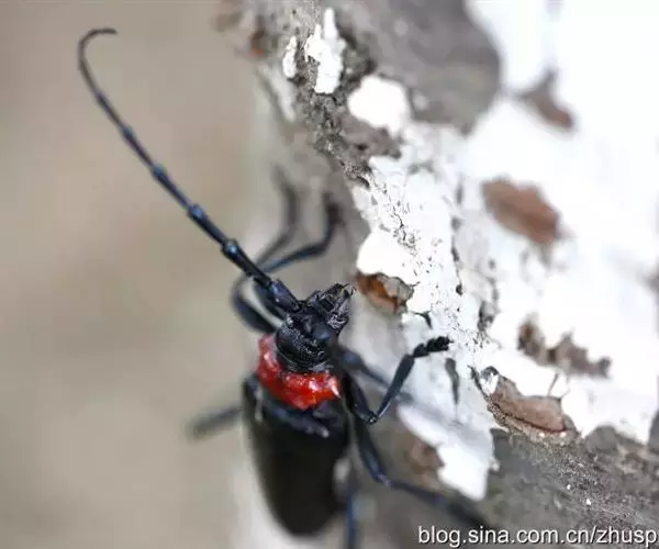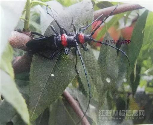 桃红颈天牛属鞘翅目,天牛科。体黑色,有光亮;前胸背板红色,背面有4个光滑疣突,具角状侧枝刺;鞘翅翅面光滑,基部比前胸宽,端部渐狭;雄虫触角超过体长4~5节,雌虫超过1~2节。它体长28~37mm。主要分布于北京、东北、河北、河南、江苏、浙江等地。