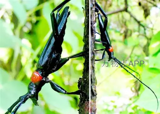 成虫:体黑色,有光亮;前胸背板红色,背面有4个光滑疣突,具角状侧枝刺;鞘翅翅面光滑,基部比前胸宽,端部渐狭;雄虫触角成虫 有两种色型:一种是身体黑色发亮和前胸棕红色的“红颈型”,另一种是全体黑色发亮的“黑颈”型。据初步了解,福建、湖北有“红颈”和“黑颈”两型的个体,而长江以北如山西、河北等地只见有“红颈”个体。成虫体长约28-37毫米,体黑色发亮,前胸背面大部分为光亮的棕红色或完全黑色。头黑色,腹面有许多横皱,头顶部两眼间有深凹。触角蓝紫色,基部两侧 各有一叶状突起。前胸两侧各有刺突一个,背面有4个瘤突。鞘翅表面光滑,基部较前胸为宽,后端较狭。雄虫身体比雌虫小,前胸腹面密布刻点,触角超过虫体5节;雌虫前胸腹面有许多横皱,触角超过虫体两节。