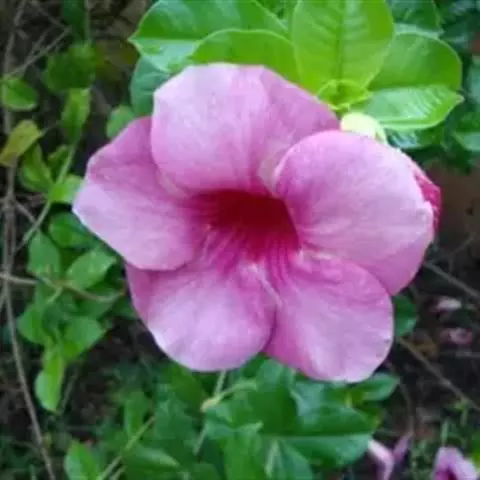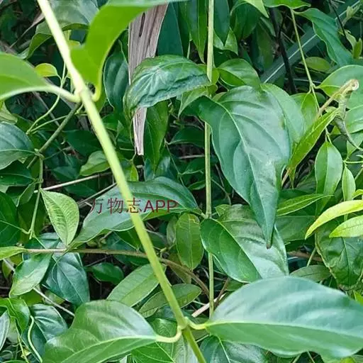 常绿木质藤本,长3-12米。小枝圆柱形,幼时具纵棱;除苞片边缘和花梗幼时被毛外,全株均无毛。叶片膜质,卵形、卵状长圆形或卵状披针形,长5-12厘米,宽2-6厘米,顶端渐尖,基部阔楔形至近圆形;侧脉每边5-7条,上面扁平,下面凸起;叶柄长6-12毫米。