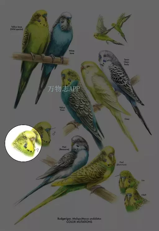 2.淡色型虎皮鹦鹉可分为上体黄色,腹部绿色和上体白色,腹部蓝色两个品系,翅上均有黑色斑点(也有一些没有)。