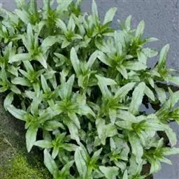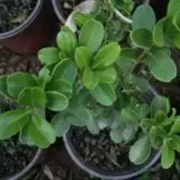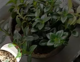 板凳果常绿亚灌木,铺地生长。株高20cm,冠径25cm。每个茎顶端生3~6片叶,叶卵形,边缘有锯齿,…