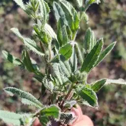 基生叶具柄,倒卵状长圆形,长2-5厘米,先端钝,基部渐狭为叶柄;茎生叶长圆形或卵状披针形,长2-4厘米,宽0.5-1厘米,无柄,两面均被基部具基盘的硬毛及短硬毛。