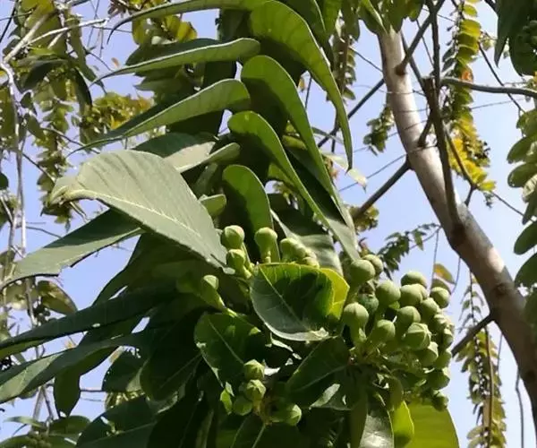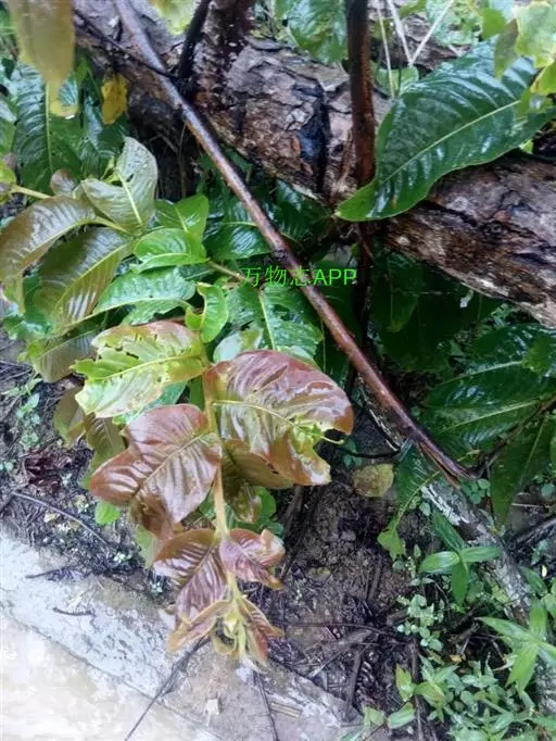 乔木;树皮褐灰色,有皱褶裂纹;板状根不甚发达;枝下垂,螺旋状或轮生于树干上,幼时具4棱。叶阔椭圆形、矩圆形或卵状矩圆形,长12-15厘米,宽5-7厘米,顶端短渐尖,基部深裂成心形,裂片圆形,中脉在上面下陷,在下面凸起,侧脉20-24对,粗壮,明显;叶柄长4-8毫米,粗厚,带红色。