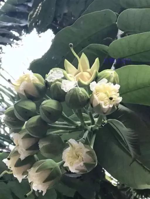 花5-6基数;花梗长3-4厘米,有关节;花开放时长2.2-2.8厘米(不连花丝),直径3-4厘米;萼筒阔杯形,裂片长约2厘米,宽约1厘米;花瓣近卵形,连柄长2.5-3厘米,宽1.5-2厘米;雄蕊极多数,2轮排列,花丝长4-5厘米,花药长1-1.2厘米;子房半下位,6或5室,有胚珠多数,花柱长3-4厘米,柱头微裂。蒴果长3-4厘米,直径3.2-3.5厘米,成熟时从顶端向下开裂成6-9枚果爿;种子长约4毫米 。花期3-4月,果熟期6-7月。