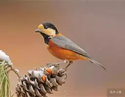 杂色山雀(Parus varius)体小(12厘米),嘴粗圆,体色明显。 杂色山雀 额、眼先棕黄,颊斑浅棕。头顶黑、具细顶冠纹。喉黑,下体棕红。后颈棕,背灰。国内分布在辽宁、台湾等地,国外主要分布于朝鲜、日本等地。