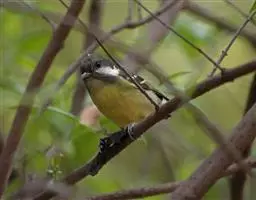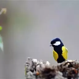 黄腹山雀(Parus venustulus)属雀形目山雀科山雀属。 黄腹山雀 全长约10cm。是中国特有鸟类,属稀有鸟类,应注意保护。腹部黄色,体型较小且无大山雀及绿背山雀胸腹部的黑色纵纹。雄鸟头部及喉、胸黑色,头侧具大型白斑,枕部有一白色沾黄的块斑。背蓝灰色。飞羽暗褐色,翼上具两条白色沾黄的翅斑。尾羽和尾上覆羽黑色。体腹面黄色。雌鸟额、头顶、眼先和背灰绿色,喉、两颊及耳羽白色,下体淡黄沾绿色。栖息于海拔500~2000米的山地,常结群活动,于高大的针叶树和阔叶树上或穿梭于灌丛间,有时与大山雀混群,主要取食昆虫,也吃植物性食物。4月开始繁殖,在树洞中营巢,每窝产卵5~7枚,卵白色,具红色或褐色点斑。黄腹山雀在山雀家族中是少有的“夫妻”双栖双飞鸟,可以说是山雀中的爱情鸟。国内主要分布在甘肃、陕西、河南、山西、湖北、湖南、江苏、上海、浙江、江西、安徽、福建、广东、广西、四川、贵州、河北、北京。