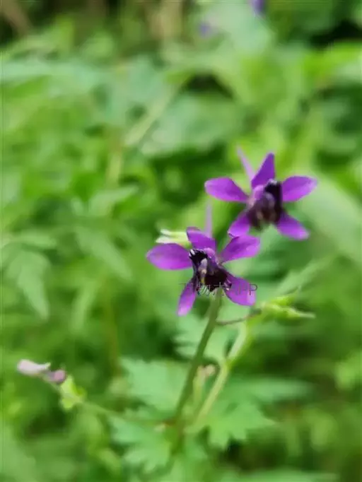 总状花序有(1-)2-15花;轴和花梗被反曲的短柔毛;基部苞片叶状,其他苞片小,披针形至披针状钻形,长2.5-4.5毫米;花梗长0.4-1.2厘米;小苞片生花梗中部,披针状线形,长2.5-4毫米;花长1-1.8(-2.5)厘米;萼片堇色或紫色,椭圆形至长圆形,长6-9(-11)毫米,外面疏被短柔毛,距钻形或圆锥状钻形,长5-9(-15)毫米,稍向上弯曲或近直;花瓣紫色,无毛,上部变宽;退化雄蕊与萼片同色,无毛,瓣片斧形,二深裂近基部;雄蕊无毛;心皮3,子房疏被短柔毛或近无毛。