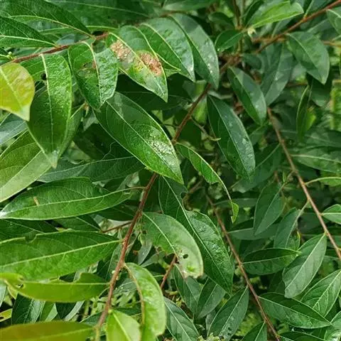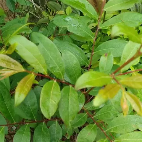 常绿灌木或乔木,通常高1-3米,稀7-12米;除子房和蒴果外,全株均无毛。叶片革质,椭圆形、长圆形或长圆状披针形,长6-16厘米,宽2.5-6厘米,顶端钝或急尖,基部急尖或阔楔形而稍下延,两侧近相等,上面深绿色,下面淡绿色,干后黄绿色;侧脉每边5-7条;叶柄长3-5毫米;托叶三角状披针形,长2.5-3毫米。