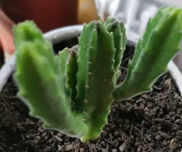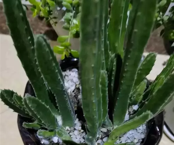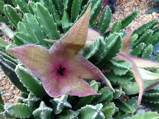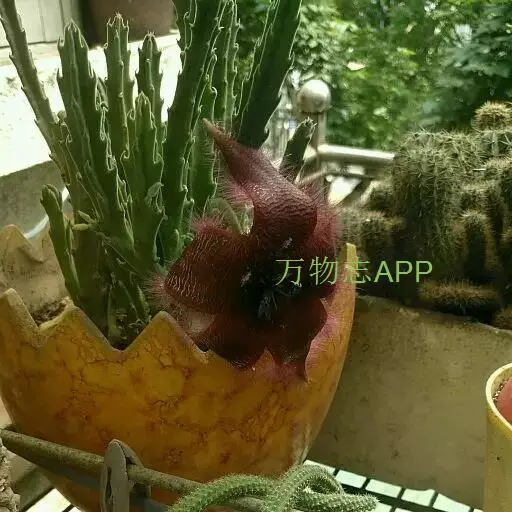茎粗,四角棱状,直立向上,高20-30CM,基部分枝,有齿状突起,灰绿色。花大,五裂张开,星形,淡黄色,具淡黑紫色横斑纹,边缘生长细毛,具臭味。秋季开花,花大奇丽,极象海星。为传种接代以恶臭引诱苍蝇授粉,故又称臭肉花。