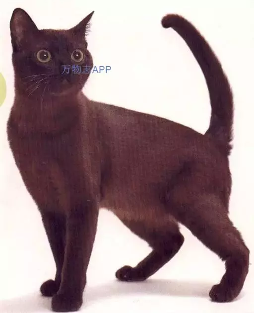 头呈三角形,有较少的绒毛,头略短于泰国猫,下颔骨强壮,颧骨高,鼻子略短,耳朵基部较宽,耳尖呈圆弧形。眼睛上眼眶向上吊,下眼眶为圆形,眼睛为金黄色,两眼间距离较宽。体型中等,肌肉发达,长颈、圆胸,尾长而直,呈锥形。四肢细长,前肢较后肢短,脚爪小,呈椭圆形。被毛短有光泽,如缎子一般,毛色为深褐色 。