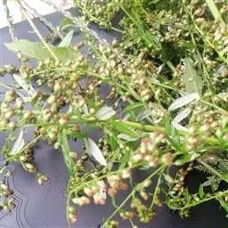 艾叶第1茬收获期为6月初,于晴天及时收割,割取地上带有叶片的茎枝,并进行茎叶分离,摊晒在太阳下晒干,或者低温烘干,打包存放。7月中上旬,选择晴好天气收获第2茬,下霜前后收取第3茬,并进行田间冬季管理。