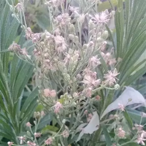 头状花序椭圆形,直径2.5-3(-3.5)毫米,无梗或近无梗,每数枚至10余枚在分枝上排成小型的穗状花序或复穗状花序,并在茎上通常再组成狭窄、尖塔形的圆锥花序,花后头状花序下倾;总苞片3-4层,覆瓦状排列,外层总苞片小,草质,卵形或狭卵形,背面密被灰白色蛛丝状绵毛,边缘膜质,中层总苞片较外层长,长卵形,背面被蛛丝状绵毛,内层总苞片质薄,背面近无毛;花序托小;雌花6-10朵,花冠狭管状,檐部具2裂齿,紫色,花柱细长,伸出花冠外甚长,先端2叉;两性花8-12朵,花冠管状或高脚杯状,外面有腺点,檐部紫色,花药狭线形,先端附属物尖,长三角形,基部有不明显的小尖头,花柱与花冠近等长或略长于花冠,先端2叉,花后向外弯曲,叉端截形,并有睫毛。瘦果长卵形或长圆形。花果期7-10月。